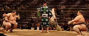 Jūryō (十両), est la seconde division, comprenant 28 lutteurs[1]. Son nom signifie « dix ryō », soit la somme que les lutteurs recevaient généralement à une certaine époque. Le nom officiel est en fait jūmaime (十枚目), ce qui signifie « dixième place », et peut être entendu ou lu dans les communications officielles. Mais l'usage, y compris dans le monde-même du sumo, est d'appeler cette division jūryō. Les lutteurs de jūryō et makuuchi sont appelés sekitori. Les lutteurs de jūryō, comme ceux de makuuchi, reçoivent un salaire mensuel ainsi que des bénéfices complémentaires liés à leur statut de sekitori. Les lutteurs des divisions inférieures sont considérés comme en formation et reçoivent une indemnité réduite au lieu d'un salaire.