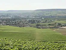 Vue de Dizy et de son église, depuis la montagne de Reims. | |