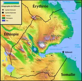 - Frontières terrestres : 516 km (Éthiopie 349 km ; Érythrée 109 km ; Somalie 58 km).