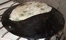 Le tout est ensuite cuit sur une poêle appelée Saj. La galette est posée sur la partie ovale, qui est chauffé par le feu.