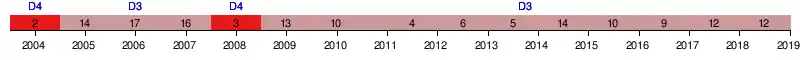 | 2014-2015 | 14e | 28 | 30 | 7 | 7 | 16 | 26 | 32 | -9 | Deuxième tour | |
