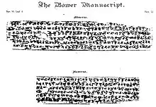 - Le manuscrit Bower (en) est un texte en sanskrit écrit dans l'alphasyllabaire brahmi vers l'an 450. Il inclut un traité médical et des proverbes. Il a été découvert en 1890 dans un monastère en ruines de l'ancien royaume bouddhiste de Kucha situé sur la route de la soie du nord, et est estimé à environ 450 ans de notre ère.