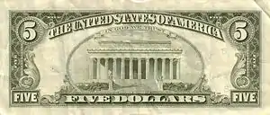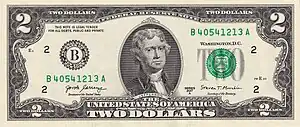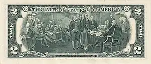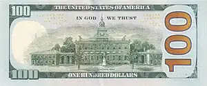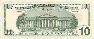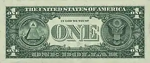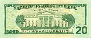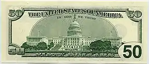En 1861, les premiers billets verts apparaissent. La maxime « In God We Trust » (« Nous croyons en Dieu »[18] ou « Nous avons confiance en Dieu ») apparaît pour la première fois en 1864 sur la pièce de 2 cents. Approuvée en 1955 par un acte du Congrès, elle est depuis 1957 systématiquement imprimée sur tous les billets américains.