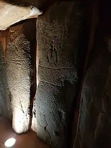 Le dolmen comporte une riche ornementation constituée de gravures (qui furent observées dès sa fouille dans les années 1930) et de peintures, en mauvais état, qui ne furent détectées que dans les années 1990. Il est probable qu'à l'origine tout l'intérieur du dolmen était peint mais il est impossible d'en connaître le décor[2]. Les nombreux signes gravés sont de nature anthropomorphes. L’orthostate n°21 est orné d'un visage humain, d'une ceinture et d'un trident, semblable à celle du dolmen de Déhus[3]. L'ensemble du décor étant placé à l'envers, la dalle a été interprétée comme une statue-menhir réemployée[2].