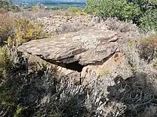 Petit dolmen déplacé ici. Il est proche du terrain de moto-cross: longer le grillage sur le point le plus haut (en bordure du terrain).