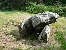 Le dolmen le plus à l'est comprend une table de couverture (1,90 m sur 2,40 m et 0,40 m d'épaisseur). La chambre est délimitée par quatre orthostates dont trois supportent la table de couverture. Selon du Châtellier, le sol de la chambre sous la table était pavé de pierres brutes sur lesquelles s'étendait une couche de sable jaune. Il découvrit, au fond de la chambre, un silex noir taillé d'un seul côté en forme de pointe de lance, sur le côté est de la chambre, un petit vase en terre contenant de petites rondelles en ardoise, très fragiles, et des plaquettes en ardoise couvertes de lignes gravées, et, au nord, un second vase de couleur noire, à fond rond, décoré de petits mamelons coniques près du bord supérieur. La couche archéologique contenait aussi des charbons de bois et quelques fragments osseux[2].