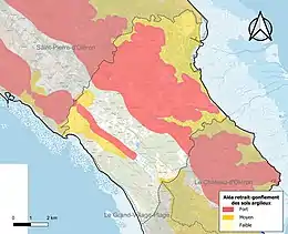 Le retrait-gonflement des sols argileux est susceptible d'engendrer des dommages importants aux bâtiments en cas d’alternance de périodes de sécheresse et de pluie. 64,7 % de la superficie communale est en aléa moyen ou fort (54,2 % au niveau départemental et 48,5 % au niveau national). Sur les 4 210 bâtiments dénombrés sur la commune en 2019, 2 544 sont en aléa moyen ou fort, soit 60 %, à comparer aux 57 % au niveau départemental et 54 % au niveau national. Une cartographie de l'exposition du territoire national au retrait gonflement des sols argileux est disponible sur le site du BRGM[25],[Carte 2].