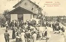 Ce n'est qu'en 1870 que Blâmont est desservie par la compagnie privée ABC (Ligne d'Avricourt à Blâmont et à Cirey) à partir de la gare d'Avricourt, ce qui provoquera en 1871 la partition de cette commune. Ce n'est que trop tardivement, avec beaucoup de lenteur et de retard, qu'un chemin de fer métrique atteint Domèvre par la compagnie du LBB (Ligne de Lunéville à Blâmont et à Badonviller). La gare est inaugurée le par le ministre Albert Lebrun sous les ovations de la population. La station, devenue habitation au XXIe siècle, est située à proximité du centre du village. Le trafic de la ligne fonctionnera jusqu'en 1942[16].