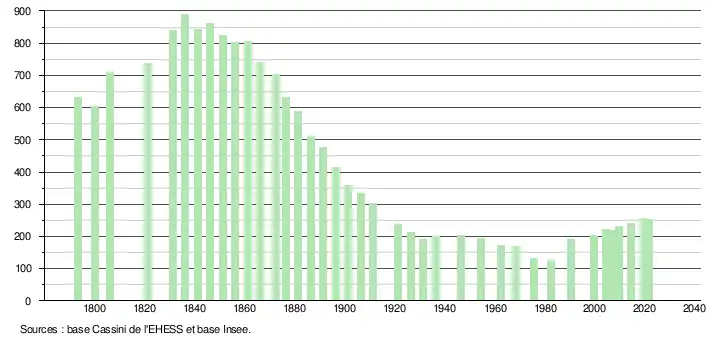 L'évolution du nombre d'habitants est connue à travers les recensements de la population effectués dans la commune depuis 1793. Pour les communes de moins de 10 000 habitants, une enquête de recensement portant sur toute la population est réalisée tous les cinq ans, les populations légales des années intermédiaires étant quant à elles estimées par interpolation ou extrapolation[31]. Pour la commune, le premier recensement exhaustif entrant dans le cadre du nouveau dispositif a été réalisé en 2004[32].
