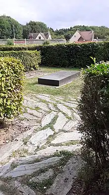 La dalle de marbre bleu foncé repose au centre d'allées pavées de schiste bleu du Cotentin. Elle était entourée par cinq cyprès bleus et l'on y déposait des fleurs bleues, ou jaunes, suivant les saisons. L'ensemble de ces tons bleutés, végétaux et minéraux, a donné le titre du jardin[6]. Ce petit cimetière contient trois piliers du XIIIe siècle provenant de la chapelle qui encadrent un banc moderne où est gravé un tercet du poète persan Omar Khayyam :
