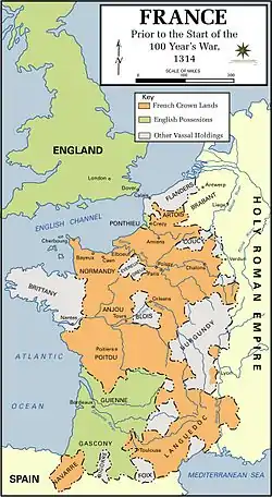 - 1360 : au traité de Brétigny, l'Aquitaine (soit un tiers du royaume) est donnée au roi d'Angleterre, pour obtenir la libération du Roi retenu prisonnier depuis la défaite de Poitiers. (RF)