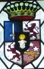 Ecartelé au premier d’azur à l’épée d’argent, la pointe en haut ; au deuxième et troisième d'argent, au lion rampant, lampassé et armé d'un sabre, le tout de gueules; au quatrième de pourpre chargé en chef de trois étoiles d'argent posées une et deux, en face de deux serpents contrepassant d'or; en pointe d'un serpent de même se mordant la queue ; sur le tout, en cœur, un écusson de sable, au buste sans tête ni bras d’idole saxonne, d’argent, à trois seins, surmonté d’un soleil d’or.