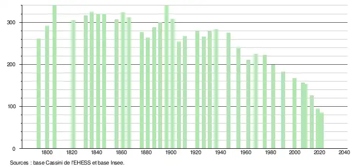 L'évolution du nombre d'habitants est connue à travers les recensements de la population effectués dans la commune depuis 1793. Pour les communes de moins de 10 000 habitants, une enquête de recensement portant sur toute la population est réalisée tous les cinq ans, les populations légales des années intermédiaires étant quant à elles estimées par interpolation ou extrapolation[25]. Pour la commune, le premier recensement exhaustif entrant dans le cadre du nouveau dispositif a été réalisé en 2008[26].