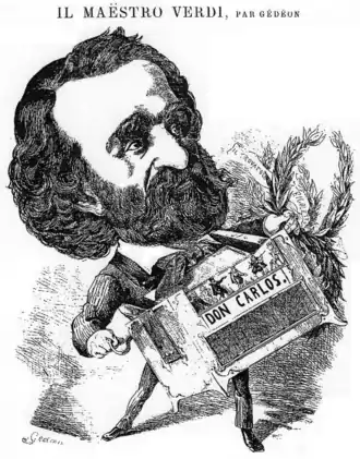 Caricature de Verdi, par Gédéon, dans Le Hanneton du , trois jours après la création de Don Carlos.