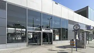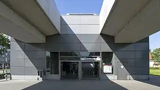 La station aérienne dispose au niveau du sol d'un hall à l'ouest, avec deux accès et un hall à l'est avec un accès. Pour l'accessibilité des personnes à la mobilité réduite les accès sont sans marches et chaque hall dispose d'un ascenseur pour faire la liaison avec le quai situé au-dessus (voir plan ci-dessous).