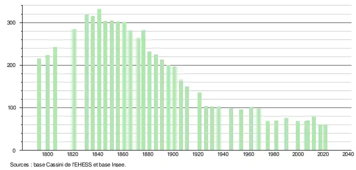 L'évolution du nombre d'habitants est connue à travers les recensements de la population effectués dans la commune depuis 1793. Pour les communes de moins de 10 000 habitants, une enquête de recensement portant sur toute la population est réalisée tous les cinq ans, les populations légales des années intermédiaires étant quant à elles estimées par interpolation ou extrapolation[15]. Pour la commune, le premier recensement exhaustif entrant dans le cadre du nouveau dispositif a été réalisé en 2007[16].