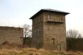 - le second étage affiche une vocation défensive, avec des ouvertures de taille moyenne ; des encoches sur les quatre faces suggèrent la présence ancienne d'un hourd.