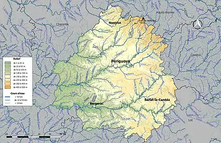 Le réseau hydrographique de la Dordogne est constitué de plus de 5 000 km de cours d'eau[11] et comprend 96 cours d'eau de longueur supérieure à 10 km, dont 12 de longueur supérieure à 50 km. Il est situé entièrement dans le bassin administratif Adour-Garonne et est découpé dans le schéma départemental des rivières en huit bassins versants principaux appartenant à trois régions hydrographiques. Le découpage de ces bassins correspond aux unités hydrographiques de référence (UHR) définies dans le schéma directeur d'aménagement et de gestion des eaux (Sdage) du bassin Adour-Garonne[12], seul le bassin de l'Isle a été divisé en deux (Isle amont et Isle aval) pour tenir compte de certaines spécificités[13] :