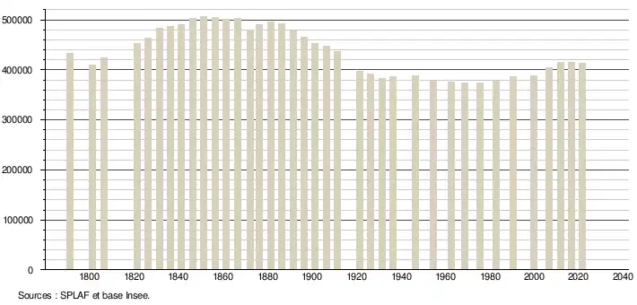 - Population municipale légale en vigueur au 1er janvier 2024, millésimée 2021, définie dans les limites territoriales en vigueur au 1er janvier 2023, date de référence statistique : 1er janvier 2021.