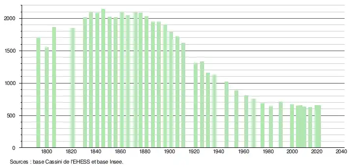 L'évolution du nombre d'habitants est connue à travers les recensements de la population effectués dans la commune depuis 1793. Pour les communes de moins de 10 000 habitants, une enquête de recensement portant sur toute la population est réalisée tous les cinq ans, les populations légales des années intermédiaires étant quant à elles estimées par interpolation ou extrapolation[18]. Pour la commune, le premier recensement exhaustif entrant dans le cadre du nouveau dispositif a été réalisé en 2004[19].