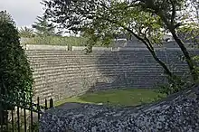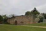 Ce site (castro Doado) est attesté dans une charte datée des années 1035-1050, et selon Michel de Boüard le castrum de Doué aurait été construit après la prise de Saumur en 1025 par le comte d'Anjou, Foulque Nerra[60]. Ce castrum dont la construction serait contemporaine de la destruction de la motte de la Chapelle, se compose d'une motte, toujours visible, d'une basse-cour, sous lesquelles se développe un souterrain aménagé qui a été étudié par J. et C. Fraysse. L'érection de la motte sur un promontoire a déplacé le bourg de Doué-la-Fontaine plus au nord de la motte de la Chapelle[59].