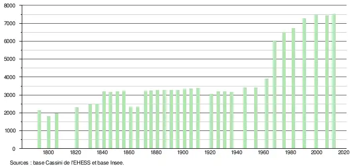 - Par convention dans Wikipédia, le principe a été retenu de n’afficher dans le tableau des recensements et le graphique, pour les populations légales postérieures à 1999, que les populations correspondant à une enquête exhaustive de recensement pour les communes de moins de 10 000 habitants, et que les populations des années 2006, 2011, 2016, etc. pour les communes de plus de 10 000 habitants, ainsi que la dernière population légale publiée par l’Insee pour l'ensemble des communes.