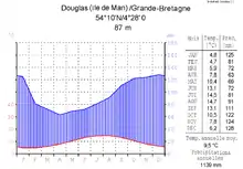 En 1511, on ne compte à Douglas qu'une cinquantaine de maisons et 810 habitants en 1726[4]. C'est à la fin du XVIIIe et surtout au début du XIXe siècle que la population s'accroit considérablement. C'est ainsi que, en 1821, Douglas compte 6 054 habitants et 14 000 en 1878[4]. Cette population continue de progresser jusqu'à la fin des années 1910 et dépasser les 20 000 habitants. Le nombre d'habitants reste stable durant tout le siècle, oscillant entre 19 000 et 22 000 à la fin du siècle. La dernière décennie du XXe siècle voit une nouvelle hausse de la population. Douglas compte 25 347 habitants en 2001 et, d'après le recensement de 2006[5], 26 218 habitants, ce qui représente environ un tiers de la population totale de l'île de Man.