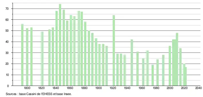 L'évolution du nombre d'habitants est connue à travers les recensements de la population effectués dans la commune depuis 1793. Pour les communes de moins de 10 000 habitants, une enquête de recensement portant sur toute la population est réalisée tous les cinq ans, les populations légales des années intermédiaires étant quant à elles estimées par interpolation ou extrapolation[15]. Pour la commune, le premier recensement exhaustif entrant dans le cadre du nouveau dispositif a été réalisé en 2004[16].