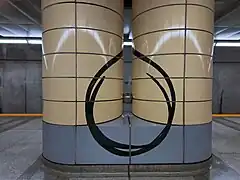 Selon les mots de l'artiste, « Spin offre aux spectateurs diverses occasions, dans toute la station, de visualiser trois coups de pinceau circulaires imaginaires flottant dans et au-delà de l'enveloppe architecturale qu'ils occupent. Grâce à des techniques d'anamorphose, chaque vue des anneaux est représentée sur les surfaces architecturales de telle sorte que, vues depuis le point de « projection », les lignes rendues se connectent en douceur et se cristallisent en une géométrie unifiée. Sous d'autres angles, les différents segments de la géométrie se fragmentent et l'anneau devient méconnaissable. Au fur et à mesure que nous nous déplaçons dans la station et que nous descendons aux niveaux inférieurs, nous voyons les anneaux sous différents angles et nous les traversons, les observant se déconstruire »[8].