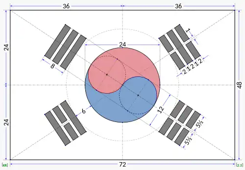 Il est nommé le Taegeukgi. Il est blanc frappé d'un Taijitu (symbole du yin yang, dont l'équivalent coréen est le um yang) rouge (dessus) et bleu (dessous), celui-ci étant nommé Taegeuk et signifiant l'origine de toute chose dans l'univers. Le long des quatre diagonales, sont disposés quatre trigrammes du Livre des Mutations représentant les quatre éléments : la terre, l’air, le feu et l'eau. Chaque symbole a son complémentaire (air et terre, feu et eau, yin et yang). C'est donc l'idée d'harmonie universelle qui a guidé la conception du drapeau.