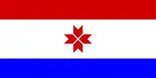 | Éléments | Bandes horizontales rouge, blanche et bleue, rosace rouge |
