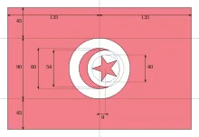 Les extrémités des branches de l'étoile sont déterminées par un disque imaginaire ayant pour centre celui de l'étoile, son diamètre étant égal à 15 % de la longueur du drapeau[23]. Les branches sont équidistantes, l'extrémité de l'une d'elles étant située sur la médiane horizontale du drapeau, à la gauche du centre du disque[23]. L'étoile est entourée du côté de la hampe d'un croissant rouge constitué par l'intersection de deux arcs, un arc externe ayant pour centre celui du disque, et dont le diamètre est égal au quart de la longueur du drapeau, et un arc interne ayant pour centre celui de l'étoile et dont le diamètre est égal au cinquième de la longueur du drapeau[23].