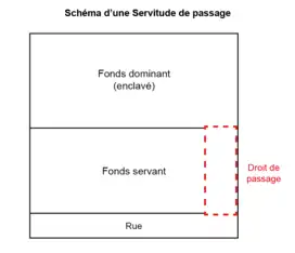 En France, un droit de passage est une servitude unilatérale reconnue aux propriétaires d'un terrain n'ayant pas d'accès à la voie publique ou ayant un accès insuffisant[2]. Ce droit de passage est codifié dans le Code Civil aux articles 682 à 685-1. Si l'enclave est avérée, le fonds enclavé se verra accordé un passage sur le terrain du fonds servant pour accéder à la rue. Le passage doit se faire du côté où le trajet est le plus court et est fixé dans l’endroit le moins dommageable à celui sur le fonds duquel il est accordé[3]. Ensuite, une rémunération est calculée proportionnellement au dommage que crée la servitude au fonds servant[4].