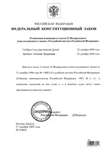 Pour être adoptée, une loi constitutionnelle fédérale doit recueillir l'approbation de trois quarts des membres du Conseil de la fédération et d'au moins deux tiers du nombre total des députés de la Douma d’État[25]. La loi doit ensuite être signée par le président dans les 14 jours suivant son approbation puis être publiée. Le président n'a pas de droit de veto sur les lois constitutionnelles fédérales.