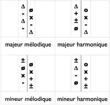 Par exemple, c∆- correspond à do majeur et g±ø correspond à sol mineur harmonique.