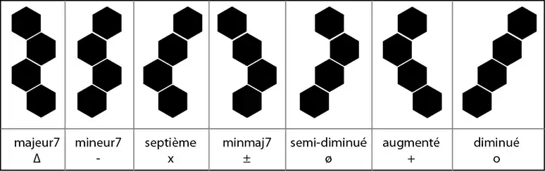 Sept formes de bases, qui sont les accords à quatre sons fondamentaux, permettent de construire les modes heptatoniques les plus fréquemment utilisés. Pour jouer une gamme, il faut prendre les deux accords à quatre sons du premier et du deuxième degré. Ainsi pour mémoriser un mode, deux informations suffisent, matérialisées par deux dessins, un pour chaque main.
