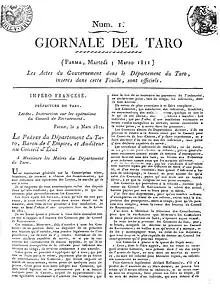 Lors de l'occupation française, le territoire est divisé en quatre circonscriptions administrés par un sous-préfet dont les chefs-lieux sont Parme, Plaisance, Borgo San Donnino (actuellement Fidenza) et Guastalla, auxquels s'ajoute en 1806 Bardi. En 1806, le territoire de Guastalla est cédé à Pauline Bonaparte[29]. Les territoires parmesans sont divisés par le préfet Hugues Nardon en treize communes avant de devenir le département français du Taro en 1808. Il intègre pleinement les institutions françaises, le département dispose de six députés membres du Corps législatif[30].
