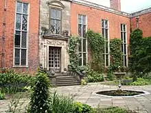 La chapelle possède des boiseries en chêne, des bancs et des retables. Les revêtements muraux en soie de la chapelle sont une recréation moderne, basée sur le tissu en soie d'origine, réalisé en 2015-2016[14]. La maison à double cour est construite en briques flamandes, des pansements en pierre et un toit en ardoise Westmorland et galloise.