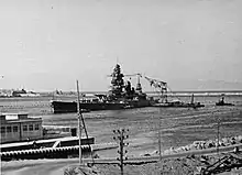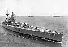 Le Dunkerque, avant qu'il n'ait reçu un capot de cheminée plus volumineux, en 1938. | |