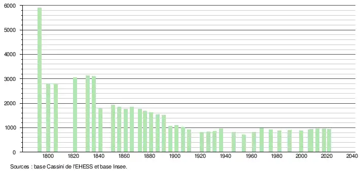 L'évolution du nombre d'habitants est connue à travers les recensements de la population effectués dans la commune depuis 1793. Pour les communes de moins de 10 000 habitants, une enquête de recensement portant sur toute la population est réalisée tous les cinq ans, les populations légales des années intermédiaires étant quant à elles estimées par interpolation ou extrapolation[34]. Pour la commune, le premier recensement exhaustif entrant dans le cadre du nouveau dispositif a été réalisé en 2007[35].