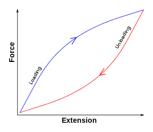 Dans un plan « contrainte - déformation », la surface sous la courbe a la dimension d'une énergie. L'aire sous la courbe de traction élastique correspond donc à l'énergie élastique absorbée par le matériau. L'aire sous la courbe de décharge correspond à l'énergie restituée par le matériau. Un matériau « caoutchouteux » ne rend donc pas toute l'énergie absorbée, c'est d'ailleurs pour cela qu'il est si souvent utilisé pour amortir les vibrations.