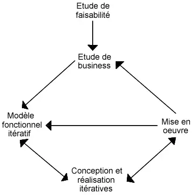 - Étude de faisabilité : Le but de cette étape est de déterminer s'il est opportun de faire le projet en question. On évalue les coûts, la valeur ajoutée attendue. Dans cette étape, on produit un Rapport de Faisabilité ainsi qu'un Plan Global de Développement. On développe parfois un prototype afin de démontrer la faisabilité technique.