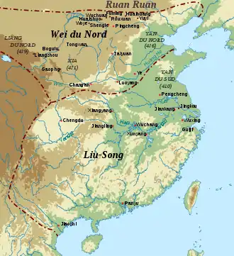Liu Yilong, l'empereur Wendi (424-453), fut intronisé et consacra ses deux premières années de règne à éliminer les aristocrates qui dominaient sa cour. Les années suivantes de son règne furent marquées par une période de paix interne qui vit l'essor de l'économie méridionale. Mais les dernières années de son règne furent plus difficiles. Les Wei du Nord avaient réunifié le Nord de la Chine en 439, profitant opportunément du vide laissé par les campagnes de Liu Yu et du refus de son successeur de mener des campagnes au Nord et de soutenir les ennemis septentrionaux de Wei. Désormais un ennemi puissant faisait face aux Liu-Song, qui plus est dirigé par un souverain qui était un remarquable guerrier, Tuoba Tao. L'empereur Wen se déida à lancer une campagne contre les Wei en 450, mais ce fut un cuisant échec, et lui succéda en 451 une réplique de grande ampleur des Wei, dont les armées contournèrent les garnisons stationnées sur la Huai et parvinrent sur le Yangzi, dans le voisinage de la capitale des Liu-Song. En dépit de leur supériorité terrestre grâce à leur cavalerie, les Wei du Nord ne disposaient pas des bateaux nécessaires pour traverser le fleuve et durent faire retraite devant l'importante mobilisation de la flotte ennemie. Ils laissèrent néanmoins plusieurs régions ravagées et emmenèrent dans le Nord de nombreux captifs, et la ligne de défense des Méridionaux était désormais déplacée depuis le fleuve Jaune vers la vallée de la Huai, exposant leur capitale plus directement aux attaques ennemies[7].