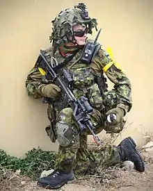 Un soldat estonien avec l'uniforme de l'ESTDCU Woodland