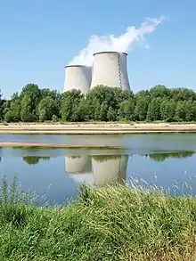 - En France, la localisation géographique des plus gros prélèvements d’eau douce s’explique par la présence de réacteurs nucléaires dotés de circuits de refroidissement ouverts : par ordre décroissant, Tricastin (Isère – Drôme), Saint-Alban (Rhône moyen), Bugey (Haut Rhône), toutes trois situées sur le Rhône, suivies de Fessenheim (Rhin supérieur), respectivement 4 895 millions, 3 668 millions, 2 363 millions, 1 752 millions de m3 prélevés annuellement[13],[14]. Ces réacteurs constituent 70 % des prélèvements d’eau douce des centrales électriques en France. Près de 90 % de l’eau prélevée est toutefois restituée au milieu naturel à proximité du lieu de prélèvement[15].