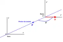 Il y a une subtilité à saisir dans le phénomène d’aberration. Si le photon se propage radialement dans un repère, il le fera aussi dans l’autre. Autrement dit, si alors . En revanche, si la vitesse est perpendiculaire à la direction du photon dans un repère, elle ne le sera pas en toute rigueur dans l’autre. En effet si alors . Et si alors .