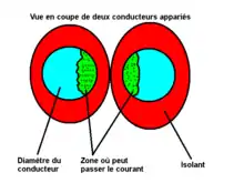 Dans un câble composé de deux conducteurs (aller et retour du courant), à haute fréquence il peut se produire un effet de proximité entre les deux conducteurs, improprement confondu avec l'effet de peau, et qui fait que le courant a tendance à circuler seulement sur les parties des conducteurs en vis-à-vis.