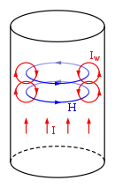 Tout courant se déplaçant dans un conducteur engendre un champ magnétique autour de ce dernier. Quand un courant continu traverse un conducteur, la différence de potentiel est uniforme et les charges se déplacent dans le conducteur de manière isotrope, ce qui donne un champ magnétique constant (H). Par contre, lorsqu'un courant alternatif circule, les charges oscillent et le champ magnétique varie, ce qui induit une boucle de courant électrique inverse (IW).