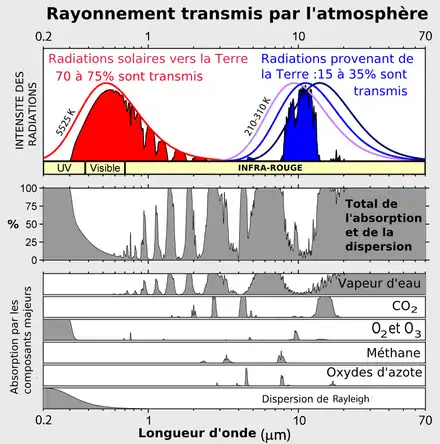 Le rayonnement s'échappe dans l'espace, dans la plage de rayonnement pour laquelle l'atmosphère est transparente. Cependant, une partie de ce rayonnement est bloqué par les plages d'absorption de certains gaz, en particulier la vapeur d'eau (H2O) et le gaz carbonique (CO2), pour lesquels l'épaisseur optique de l'atmosphère est de plusieurs centaines. L'atmosphère étant totalement opaque à ces rayonnements, l'énergie associée reste localisée : au lieu de s'échapper dans l'espace, cette partie du rayonnement (de l'ordre de 20 W m−2) reste bloquée dans la basse atmosphère, dont elle augmente la température. L'effet de serre ne s'intéresse qu'à ces rayonnements absorbés par les gaz à effet de serre, ce qui contribue à réchauffer l'atmosphère. Le transfert de chaleur entre la Terre et l'atmosphère se fait, conformément au deuxième principe de la thermodynamique, du chaud (la terre) vers le froid (l'atmosphère).