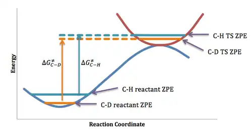 La plupart des effets isotopiques cinétiques, surtout pour la substitution de l'hydrogène par le deutérium, proviennent de la différence d'énergie entre les réactifs et l'état de transition des isotopologues en question. Cette différence peut être expliquée qualitativement dans le cadre de l'approximation Born-Oppenheimer, en supposant que la courbe d'énergie potentielle est la même pour les deux espèces isotopiques. En mécanique quantique cependant, des niveaux vibrationnels discrets sont associés à cette courbe, et le niveau vibrationnel le plus bas possède une énergie légèrement supérieure au minimum de la courbe d'énergie potentielle. Cette différence d'énergie, dite énergie du point zéro, est conséquence du principe d'incertitude de Heisenberg et nécessite une incertitude dans la longueur de liaison C-H ou C-D. Étant donné que l'espèce deutérée est plus lourde et se comporte de façon plus «classique», ses niveaux d'énergie de vibration sont plus proches à la courbe d'énergie potentielle classique, et son énergie du point zéro est inférieure. Les différences d'énergie du point zéro entre les deux espèces isotopiques, au moins dans la plupart des cas, diminuent dans l'état de transition, puisque la constante de force de rappel diminue au cours de la rupture de la liaison. Par conséquent, la plus faible énergie de point zéro de l'espèce deutérés se traduit par une plus grande énergie d'activation de sa réaction, tel qu'indiquée à la figure ci-dessous, ce qui conduit à un effet isotopique cinétique normal pour lequel (kH/kD) > 1.